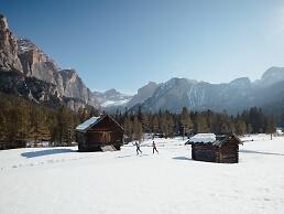 The cap pulled snug, the technical fabric moving with your body, arms and legs driving forward, before you stretches a whole day to savour, down to the last drop of energy. For those who love the rhythm of cross-country skiing, who crave lungs full of crisp mountain air, who seek that unique warmth only winter can offer, this is the place. Silent forests to glide through, open fields to cross at your own pace: all around, the Dolomite spires rising like stone cathedrals, inspiring the freedom to feel as light as a snowflake dancing in the air.