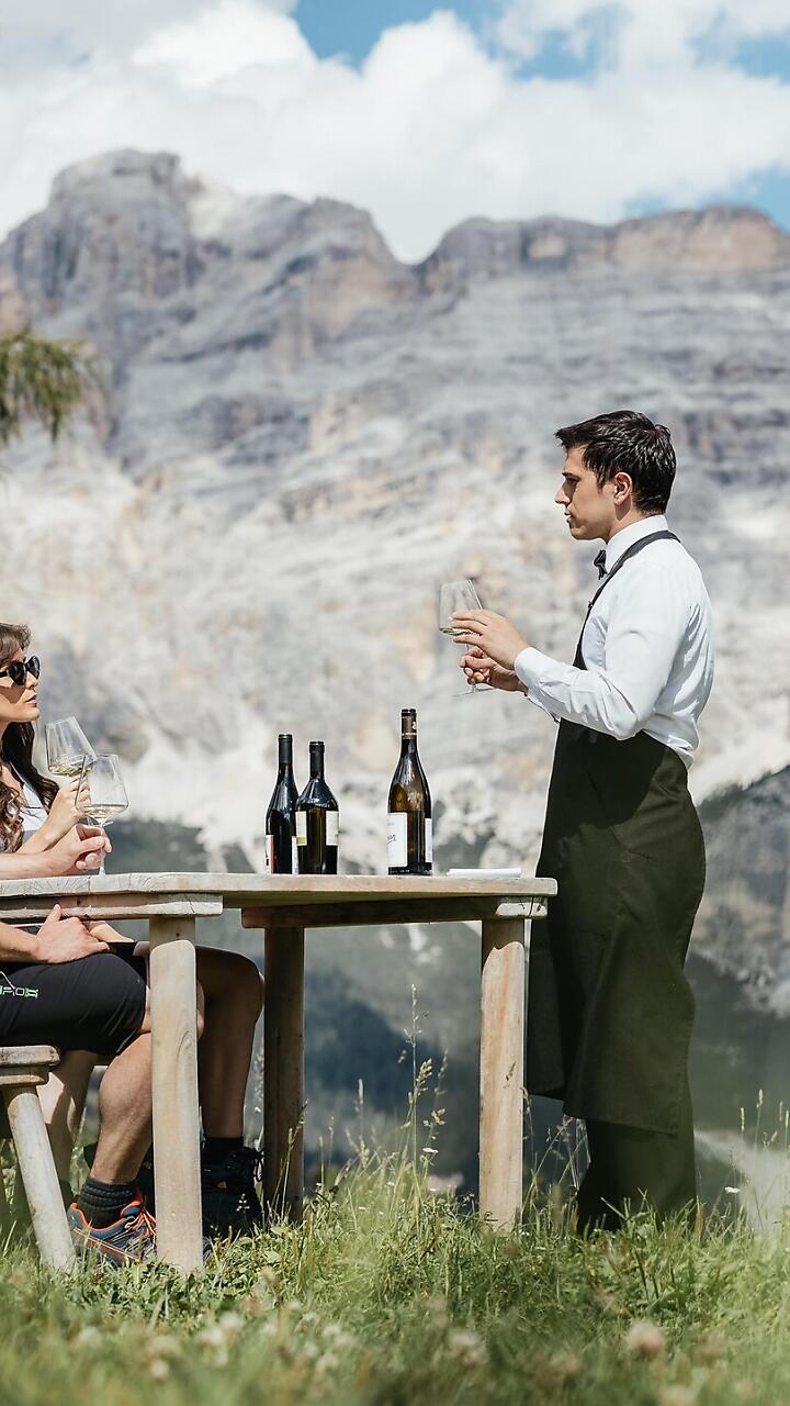 Questo luogo magico sopra La Val offre un’atmosfera tranquilla e suggestiva. Lo viviamo degustando i grandi vini rossi dell’Alto Adige, mentre lo sguardo si apre sulla spettacolare vista dei Prati Larcenëi, verso le cime Nove e Dieci del gruppo Santa Croce.