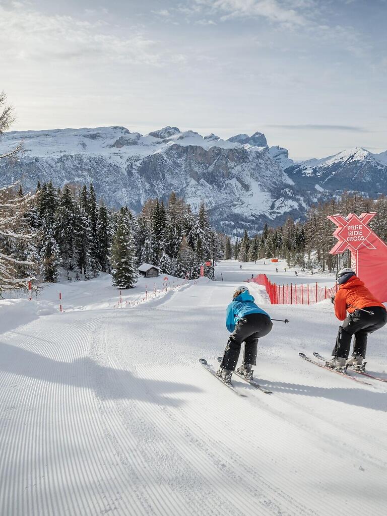 The Ski Cross Track La Crusc guarantees fun and action outside the “typical slope”. It is a revolutionary route with freeride and freestyle oriented elements, distant from the crowd, created for skiers and snowboarders of all ages. A sequence of big steep turns, rollers, drops and jumps on the perfectly primed cross-slope offers powder-entertainment at its best.